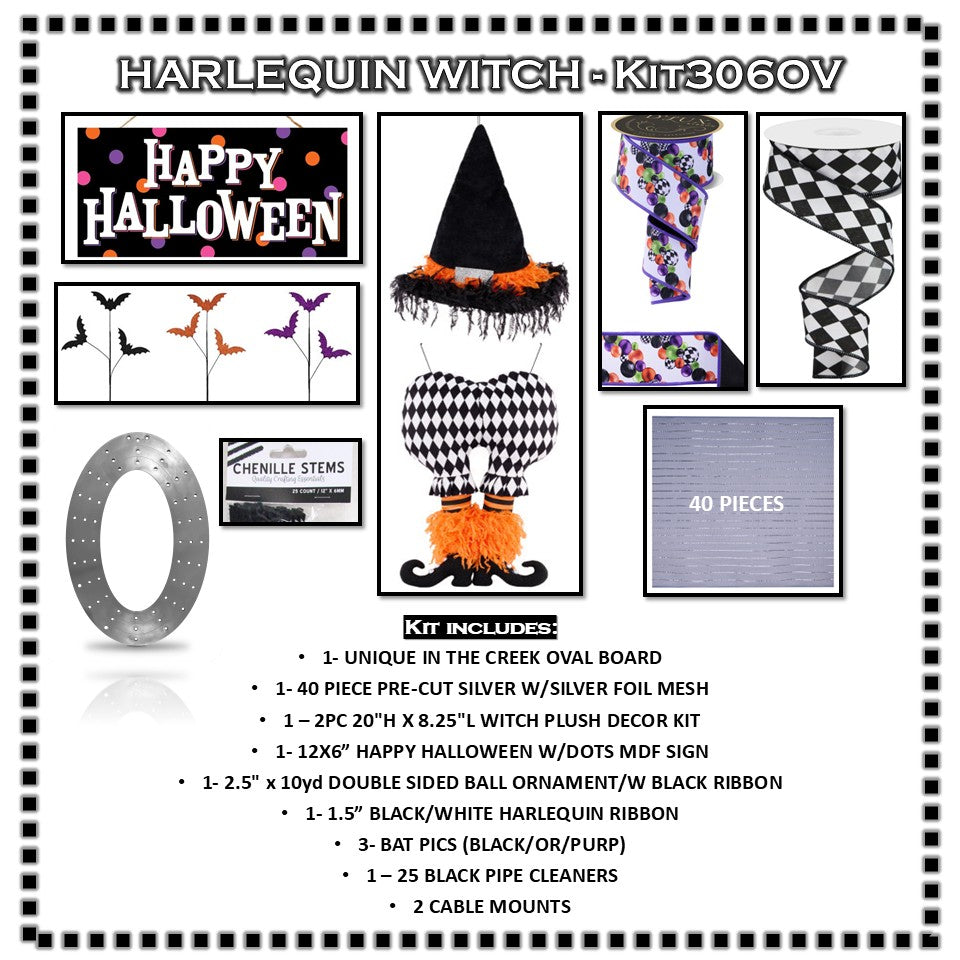 WREATH KIT | HARLEQUIN 2PC WITCH KIT | HAPPY HALLOWEEN |ORANGE/BLACK/WHITE/PURP | KIT306OV